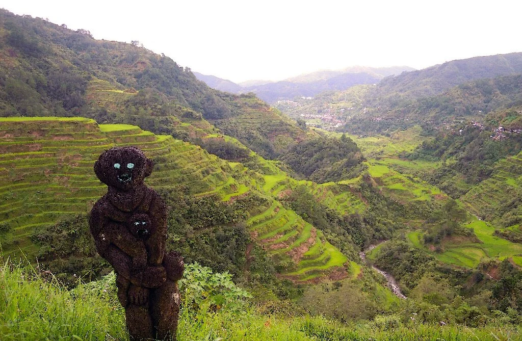 Ifugao hogang in the Banaue Rice Terraces, guardian spirits carved from tree fern trunks usually placed along pathways and in village outskirts